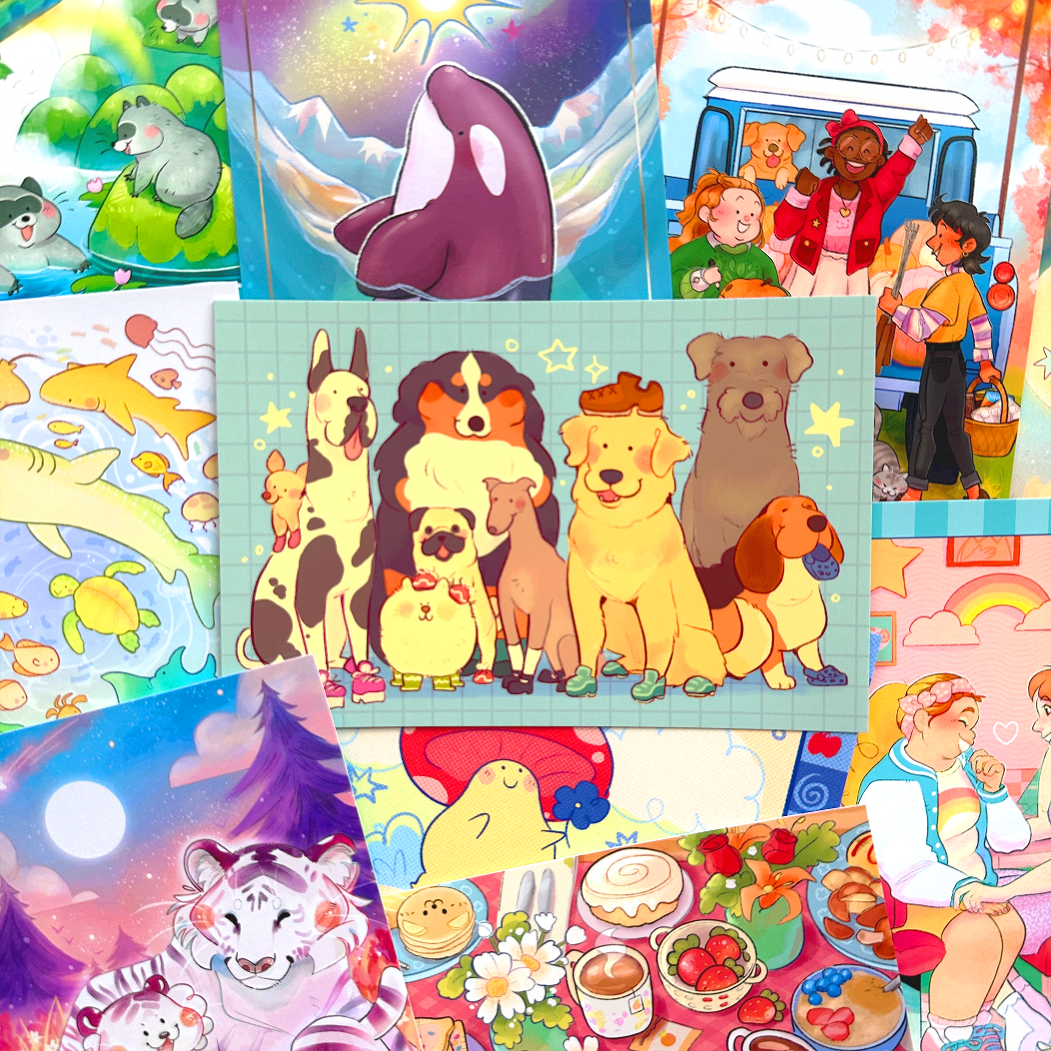 My designs are almost entirely original content that express my love of animals & nature, comforting aesthetics, yummy foods, and queer joy ♡